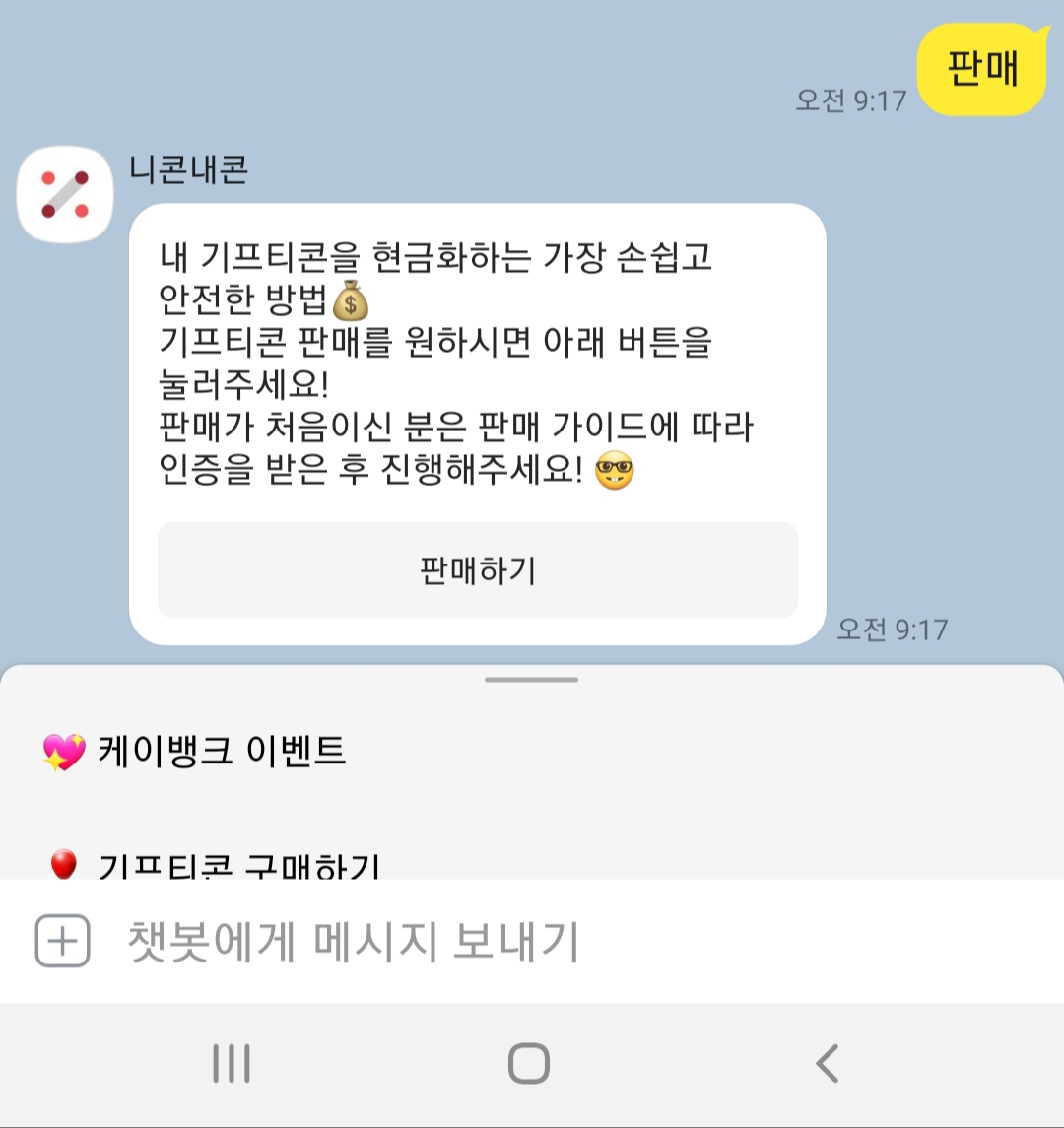 다음으로 니콘내콘 대화창에 '판매 또는 판매하기'를 입력하시면 판매하기 버튼이 나옵니다.