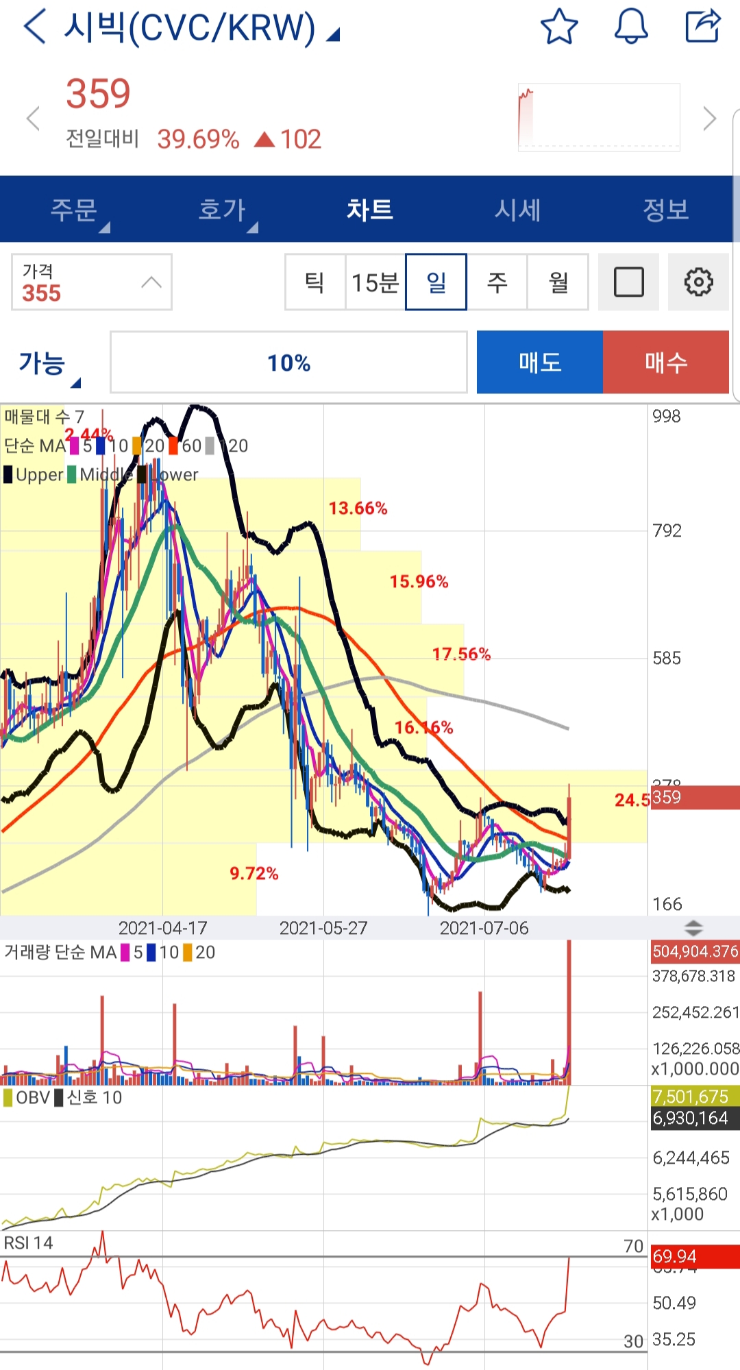 비트코인이 어제보다 하락을 해 대부분의 코인들의 가격이 떨어졌습니다. 하지만 시빅 코인은 차트를 보시면 높은 거래량을 동반한 채 60일 선을 뚫고 볼린저밴드 상단을 뚫어 지속적으로 상승하고 있습니다.