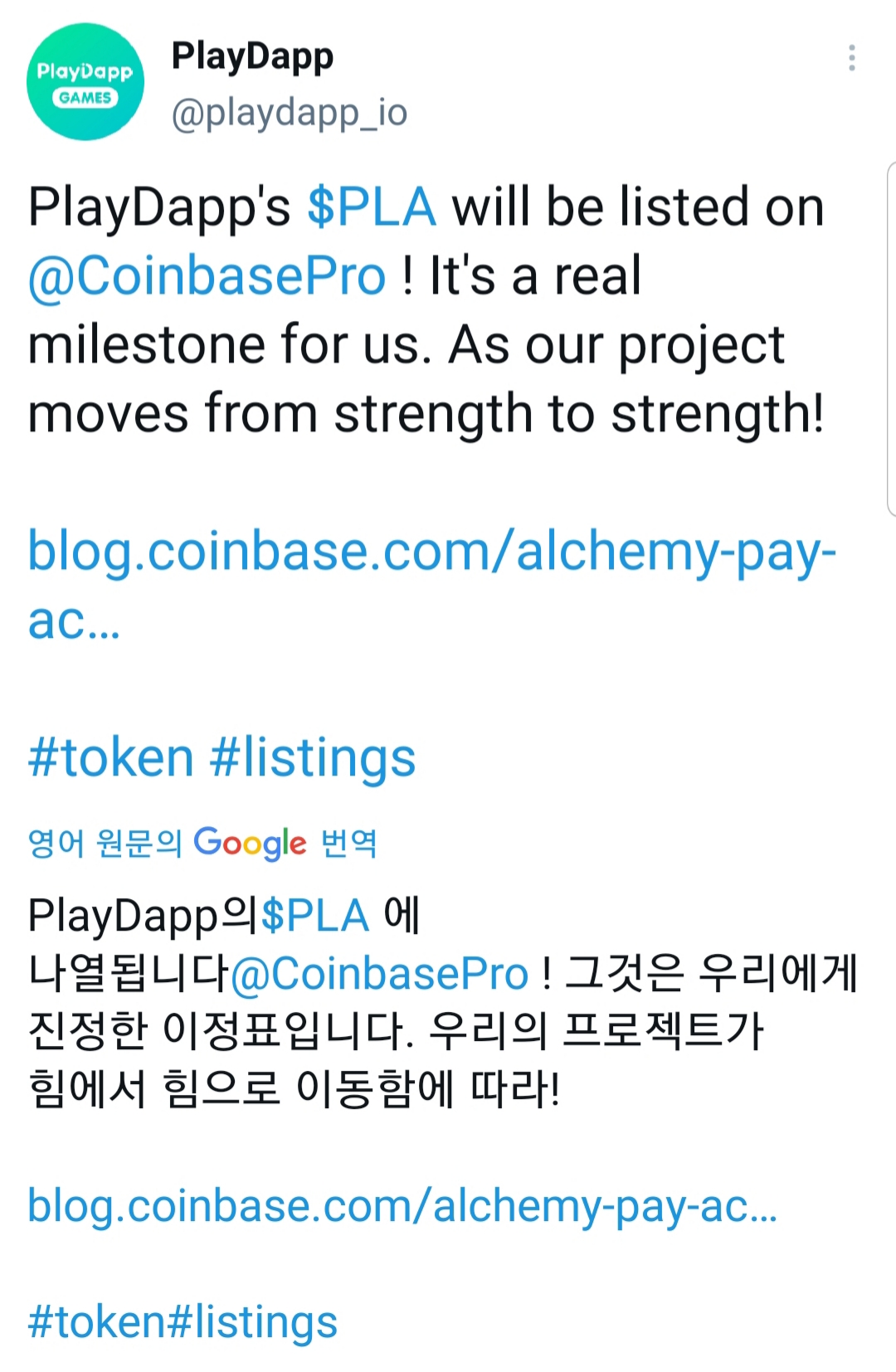 그리고 오늘 플레이댑이 코인베이스 프로에 상장한다는 또 하나의 큰 호재가 나왔습니다. 코인베이스는 미국 최대 암호화폐거래소로 웬만한 코인은 상장이 어려워 큰 호재라고 볼 수 있습니다. 국내 코인으로서는 플레이댑이 테라의 미러 프로토콜 이후 처음입니다. 이 호재는 플레이댑 트위터와 코인베이스 프로 트위터에서 확인할 수 있습니다.