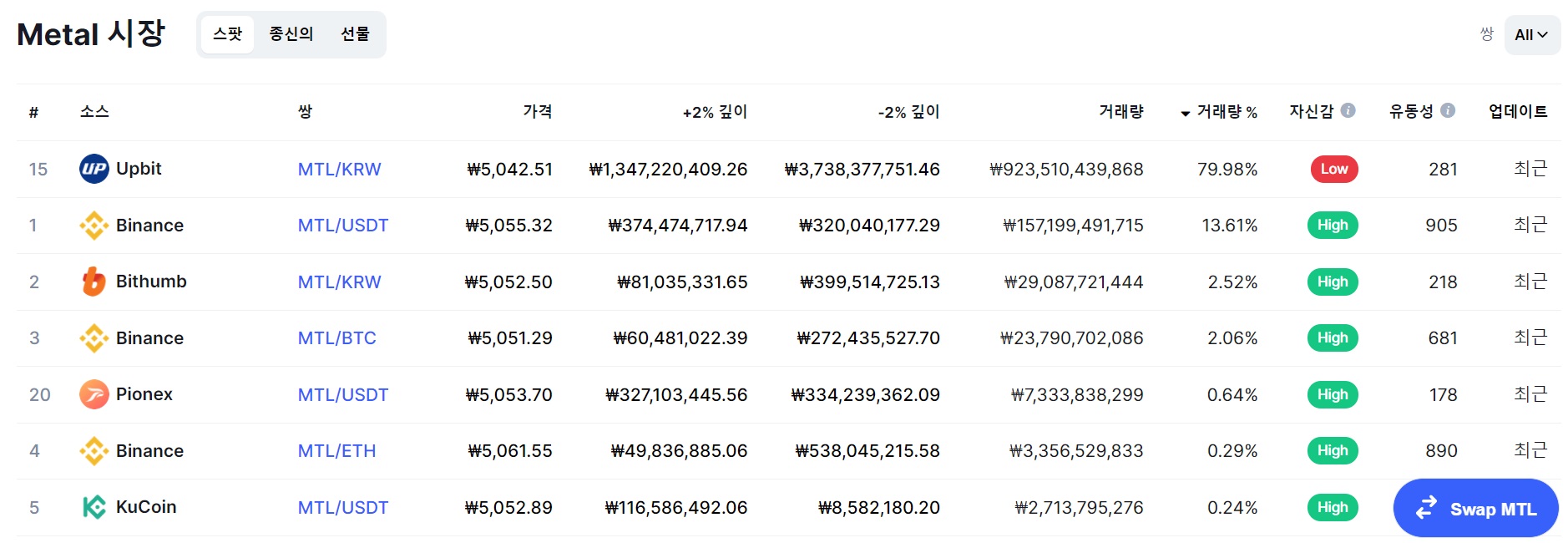 메탈 코인은 업비트 외에도 바이낸스, 후오비 글로벌, FTX 거래소에도 상장되어 있는데 거래량은 업비트가 가장 많습니다.