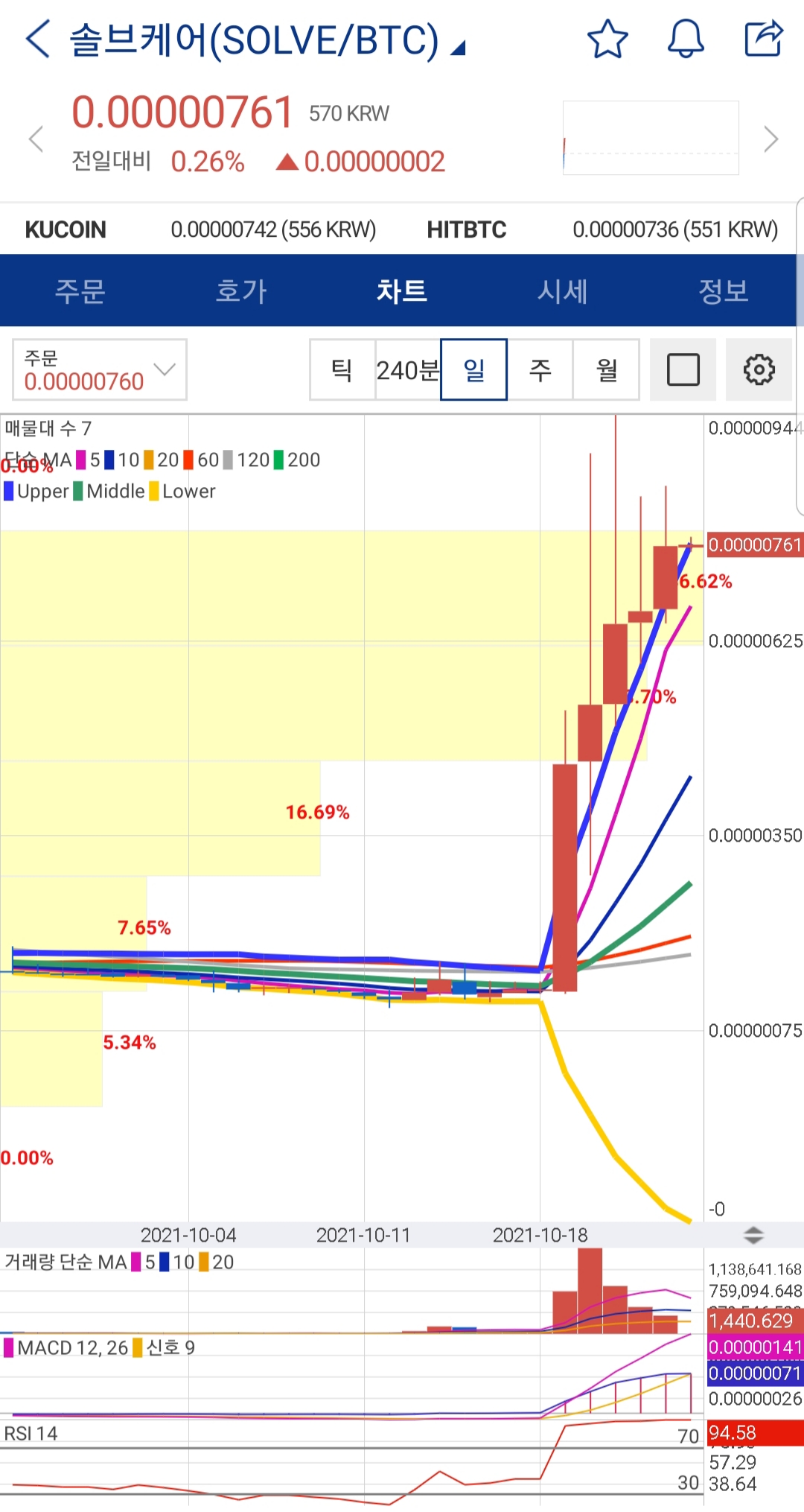 업비트 BTC마켓에 상장되어 있는 솔브케어의 일봉, 주봉을 보시면 이동평균선이 좁혀져 수렴하다가 6일째 가격이 가파르게 상승하고 있는 모습을 확인할 수 있습니다.