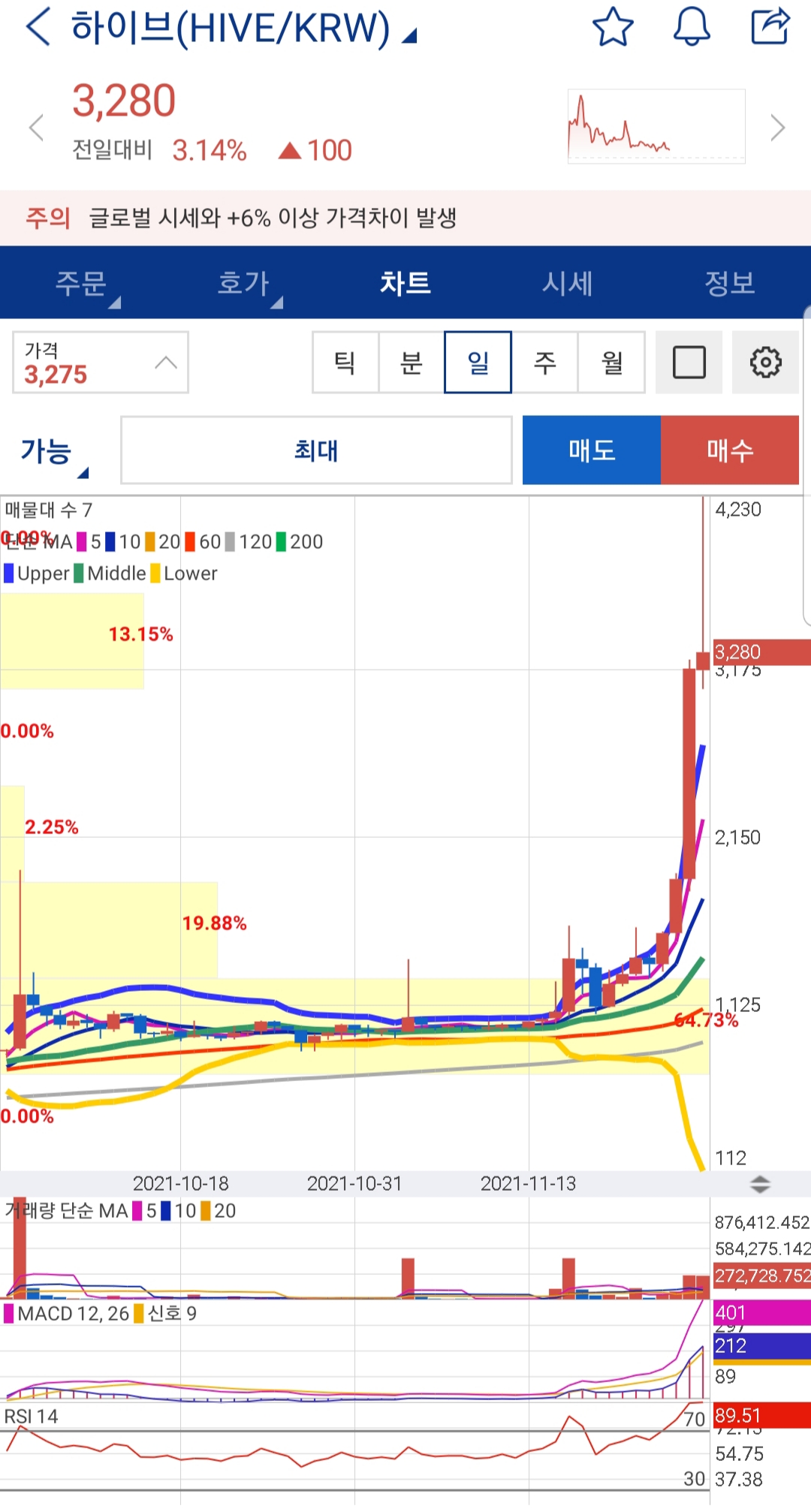 하이브는 스팀을 하드포크한 탈중앙화 플랫폼인데 파일코인과 함께 대표적인 web3 코인입니다. 현재 web3 코인들이 상승하고 있는데 얼마나 오래 상승 흐름을 유지할지는 모르겠지만 nft 코인이 오랜 동안 승승장구했던 걸 생각하면 한동안 오르지 않을까 싶습니다. 하지만 볼린저밴드를 넘어서 오늘 신고점을 기록했으니 성급히 진입하면 물리실 수 있습니다.