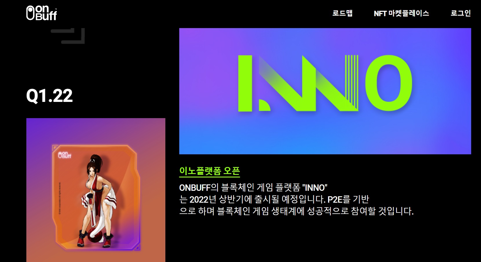 마지막으로 온버프 로드맵을 살펴보면 2022년 상반기에 온버프의 블록체인 게임 플랫폼 'INNO'가 출시될 예정이며 P2E를 기반으로 한다고 합니다. 그리고 글로벌 협업을 통해 온버프 독점 NFT 디지털 아트 알리 경매를 출시한다고 합니다.