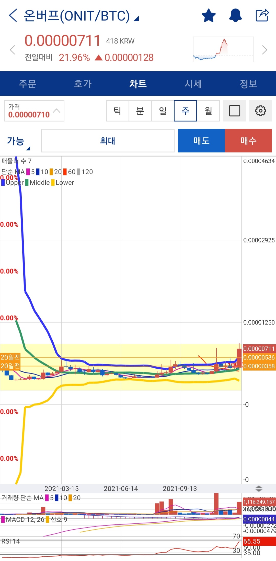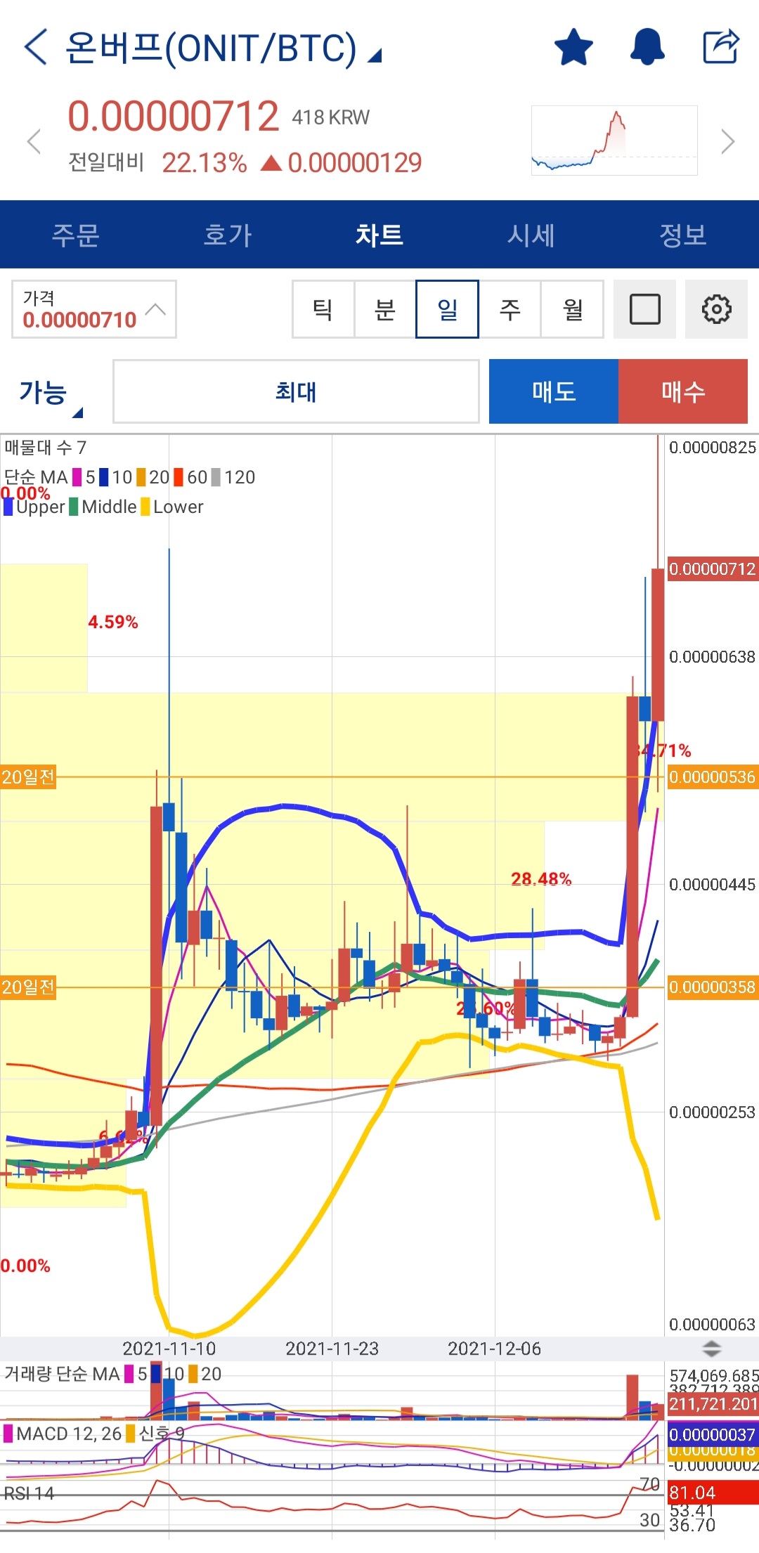 온버프 코인은 17일에 80%가 넘게 상승하고 다음날에 16% 그리고 어제도 50%가 상승하면서 업비트 원화마켓 거래대금 1위를 차지하고 있습니다. 온버프의 경우 차트가 좋아 며칠 스윙 투자로 접근하여 0.00000358 근처에서 샀다가 비트의 움직임이 불안정하여 안전하게 0.00000536에 팔기도 했는데 0.00000872까지 가기도 했습니다.