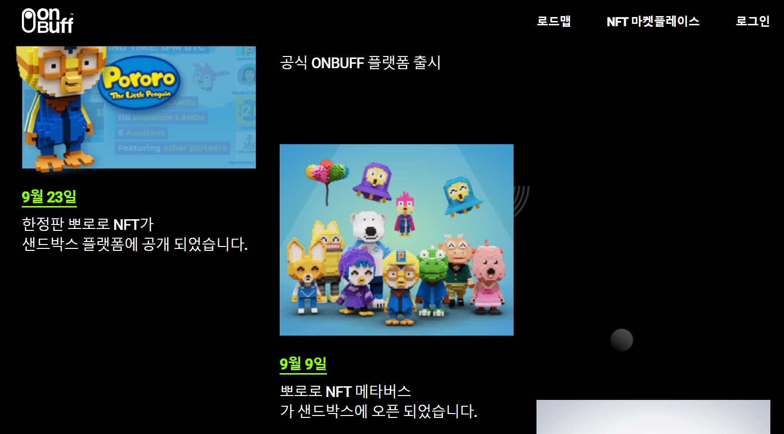 온버프 코인 첫번째 호재로는 21년 9월, 뽀로로 IP를 통한 샌드박스(SAND 약 100원대에서 1만원, 100배 이상 상승) 협업과 NFT가 있습니다. 온버프와 협업한 샌드박스는 21년 가장 크게 오른 nft코인 중 하나로 온버프 코인은 '온버프 nft 펀드'를 만들어 20억 원을 투자하기도 했습니다.