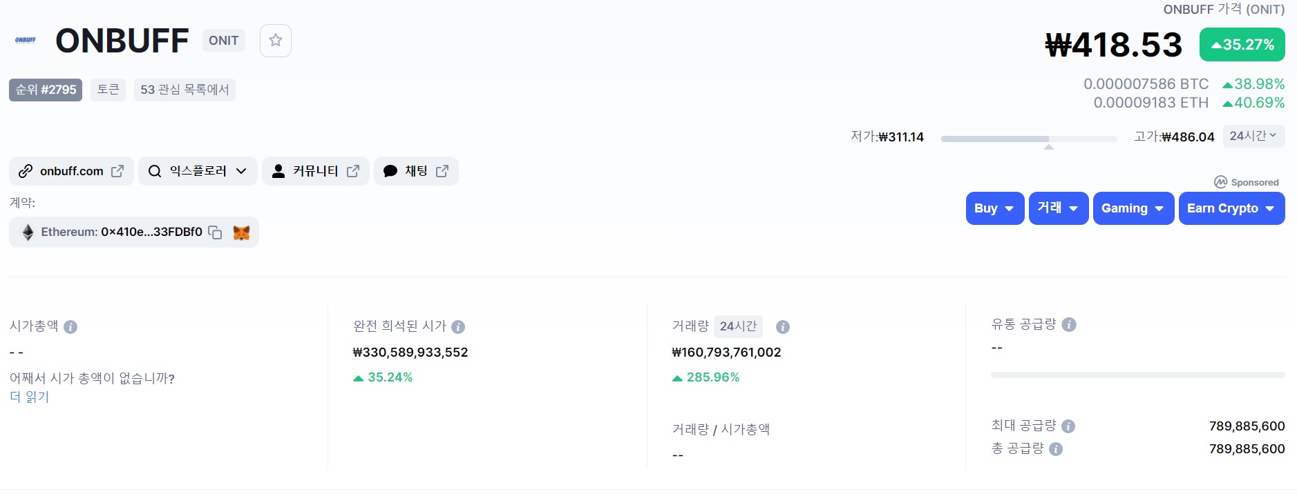 온버프 코인은 블록체인 지식재산권(IP) 중계 플랫폼으로서 코인마켓캡이나 업비트에 시총 정보가 나와 있지는 않으나 공급량이 8억 개가 안 되므로 지금 가격이 400원대인 걸로 봤을 때 그리 높지 않습니다.