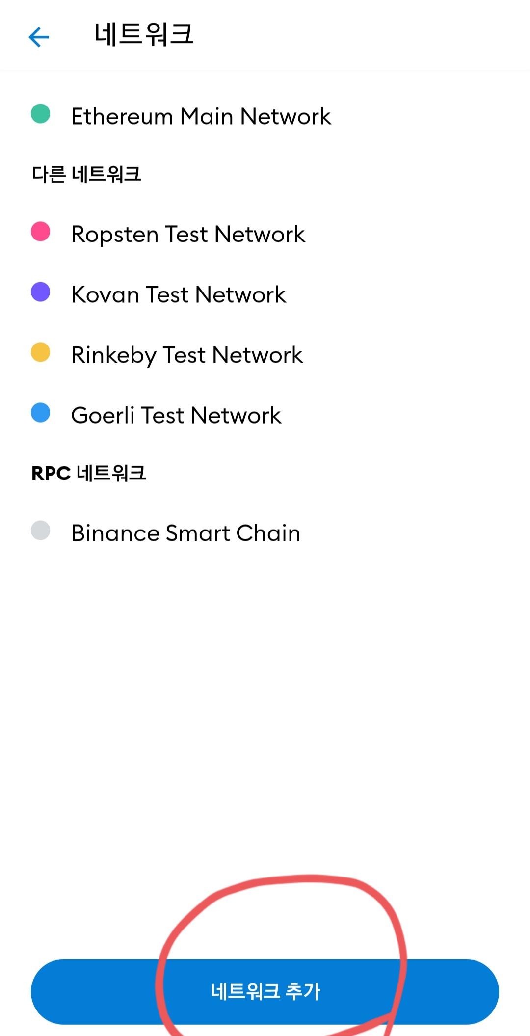 4. 네트워크 추가를 누릅니다. 참고로 저는 이미 바이낸스 스마트 체인을 추가해서 네트워크에 바이낸스 스마트 체인이 뜹니다.