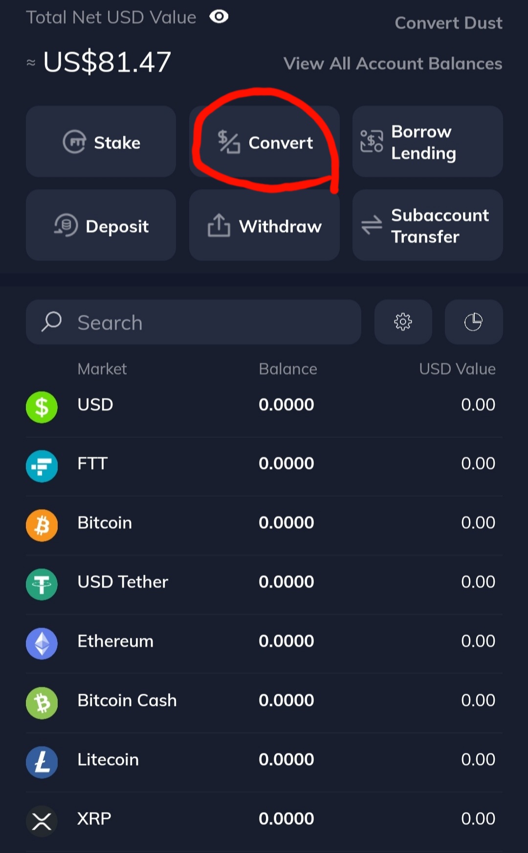 FTX 거래소에서 wallet의 convert를 누르시고
