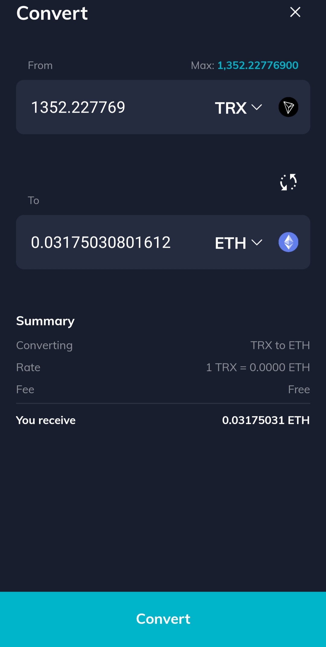 From 트론 옆에 MAX 버튼을 누르시면 트론 최대 수량이 입력되고 To 이더리움으로 설정하신 뒤 convert를 누르시면 트론이 이더리움으로 바뀝니다. 소액이시면 이 방법이 트론usdt 매도, 이더리움usdt 매수하는 두번째 방법보다 편리합니다.