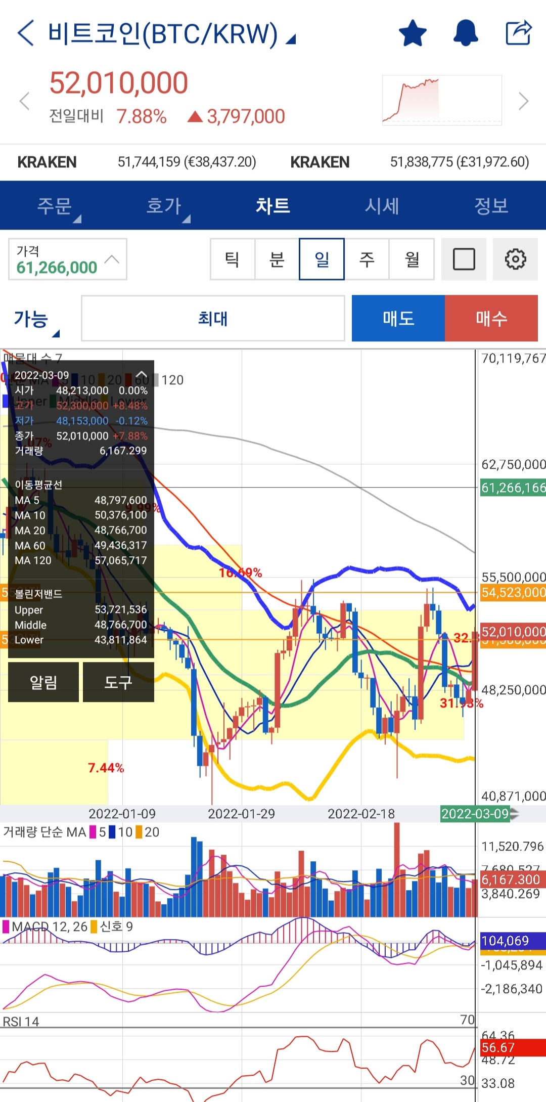 비트코인 일봉을 보시면 3월 들어 약 일주일 간 1000만원 가까이 변동을 보였는데 다행히 오늘 장대양봉을 세우며 볼린저밴드 중심선 밴드를 뚫고 상승을 했습니다.