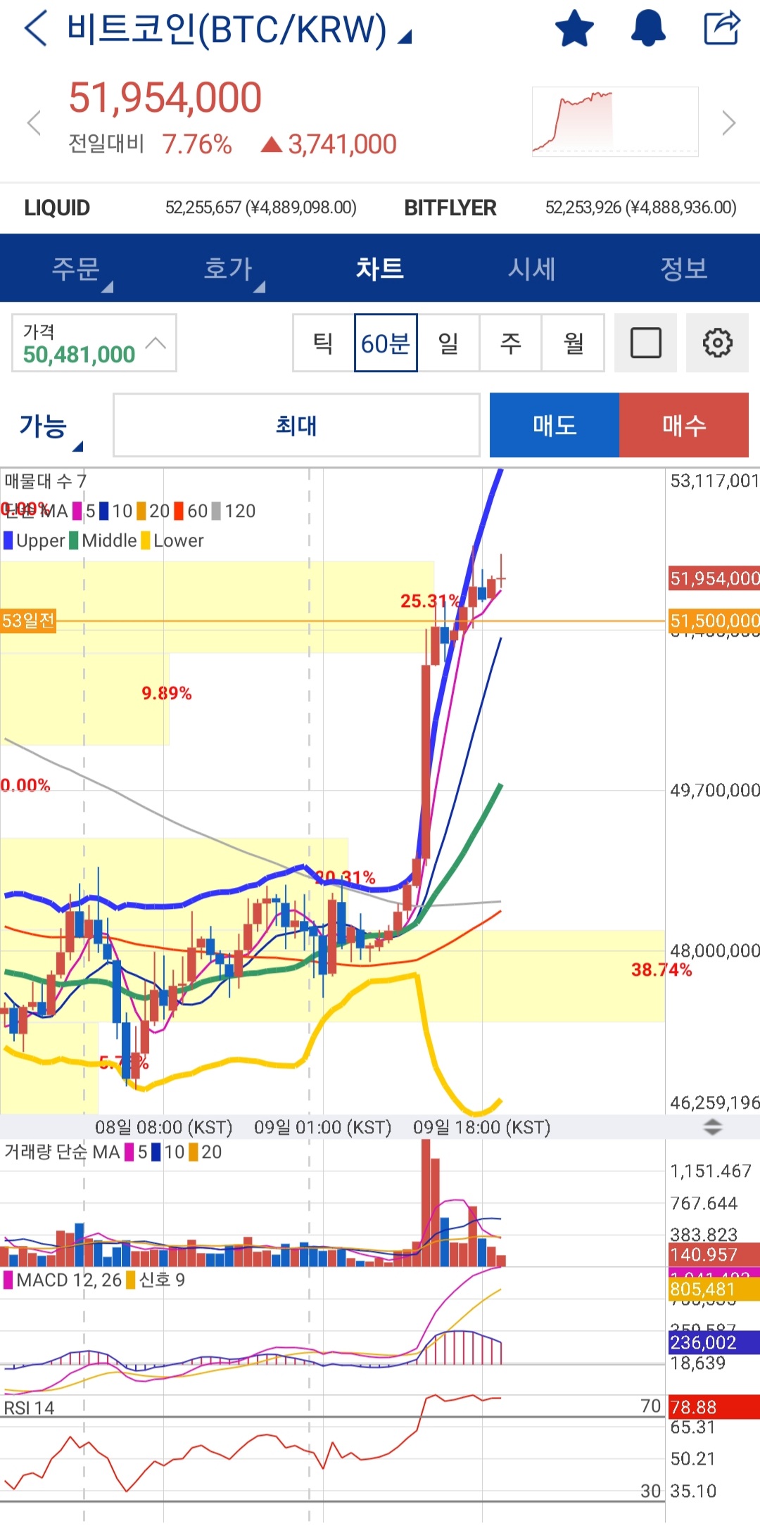 업비트와 바이낸스 모두 오늘 낮 12시부터 5% 가까이 상승을 보였습니다.