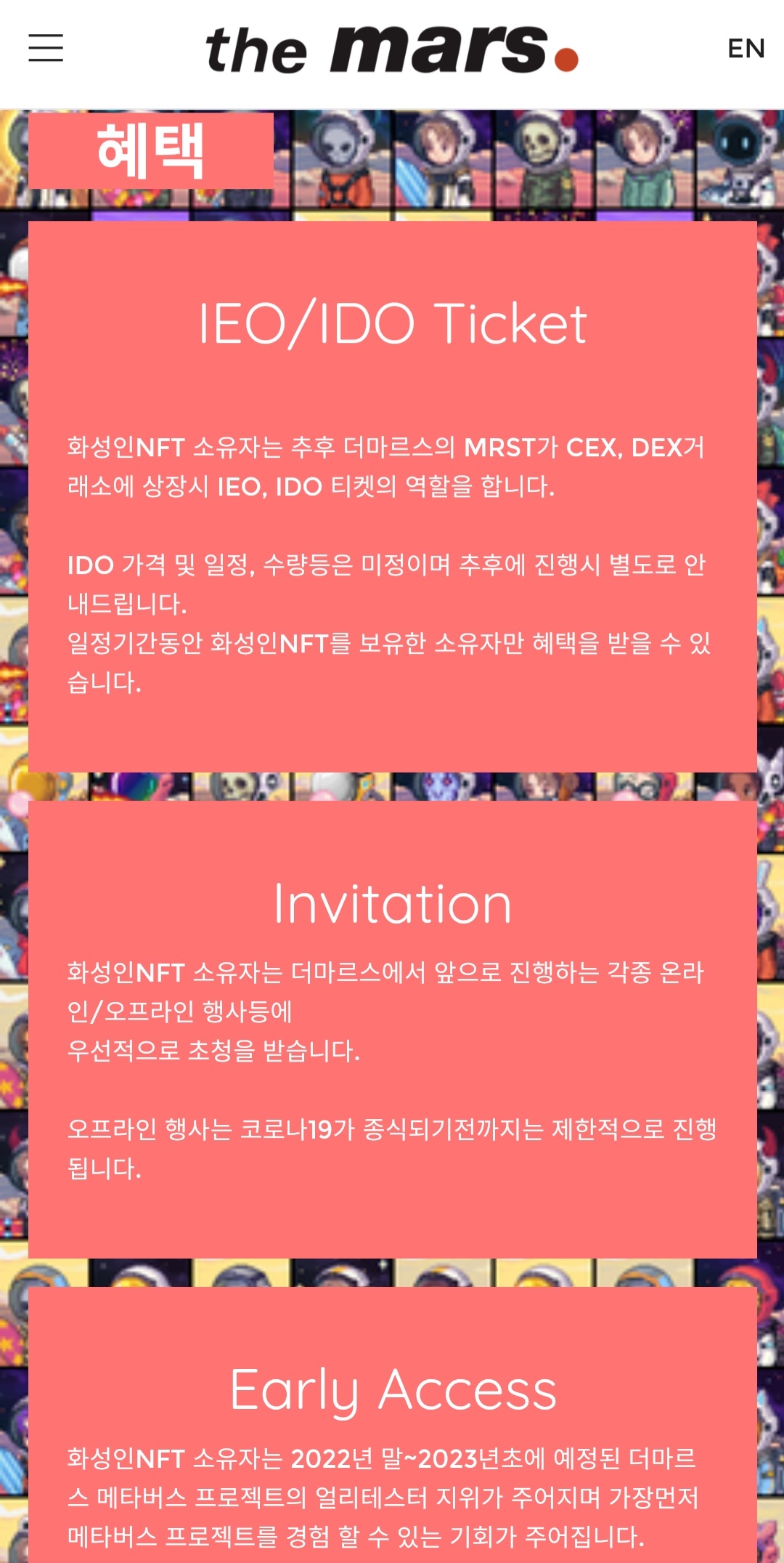 요즘 인기 있는 nft 민팅을 예로 들면 마르스의 경우 nft 홀더 혜택이 IEO, IDO 상장 예고 후 상장 가격으로 미리 구매할 수 있는 권한을 준다고 합니다.