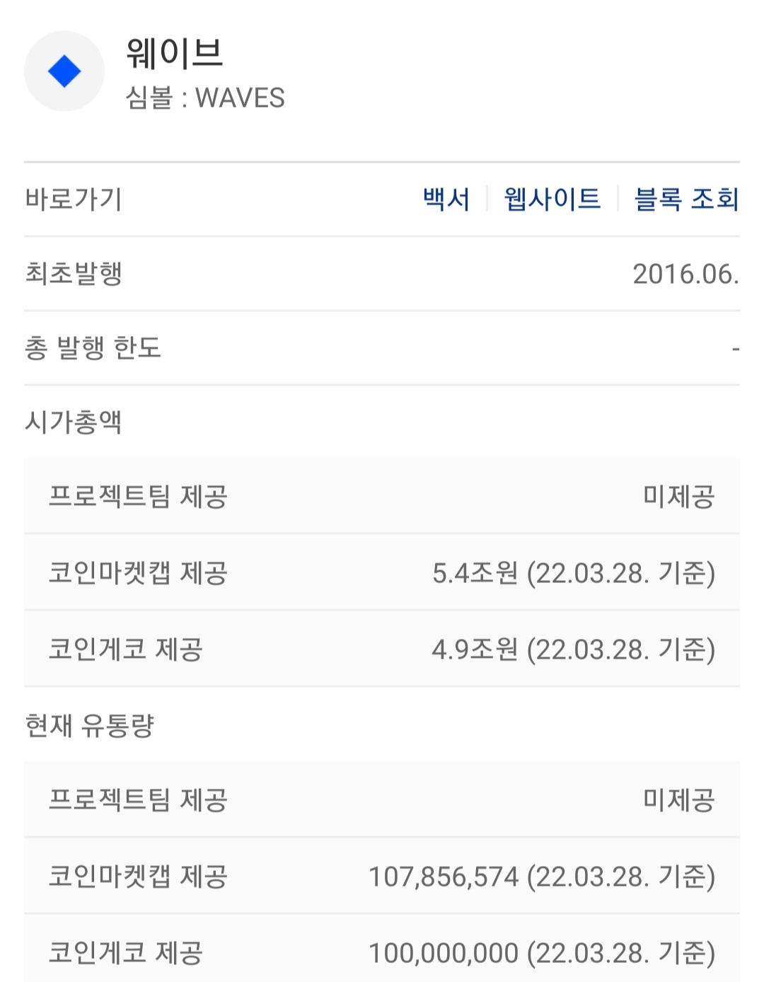 웨이브(WAVES)는 2016년에 설립된 웨이브(B2B 기업 : 기업간 전자상거래)에 사용되는 플랫폼 코인입니다. nft, DAO 등 개발자들이 원하는 서비스를 모두 제공할 수 있으며 시총이 5.7조원 정도, 유통량이 1억 개가 조금 넘습니다.