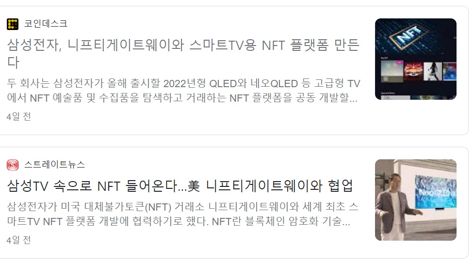 삼성전자의 벤처투자전문 자회사 삼성넥스트는 가상자산과 블록체인 투자를 확대하고 있습니다. 그리고 삼성전자는 올해 초 스마트TV에서 NFT를 사고파는 플랫폼을 선보이기도 했고 최근 미국 대체불가토큰(NFT) 거래소 니프티게이트웨이와 세계 최초 스마트TV NFT 플랫폼 개발에 협력하기로 했다고 합니다.