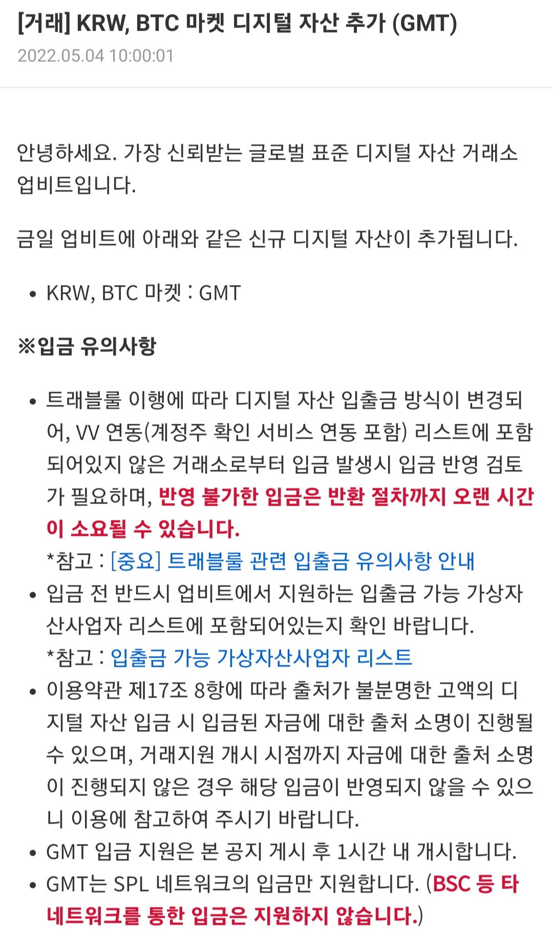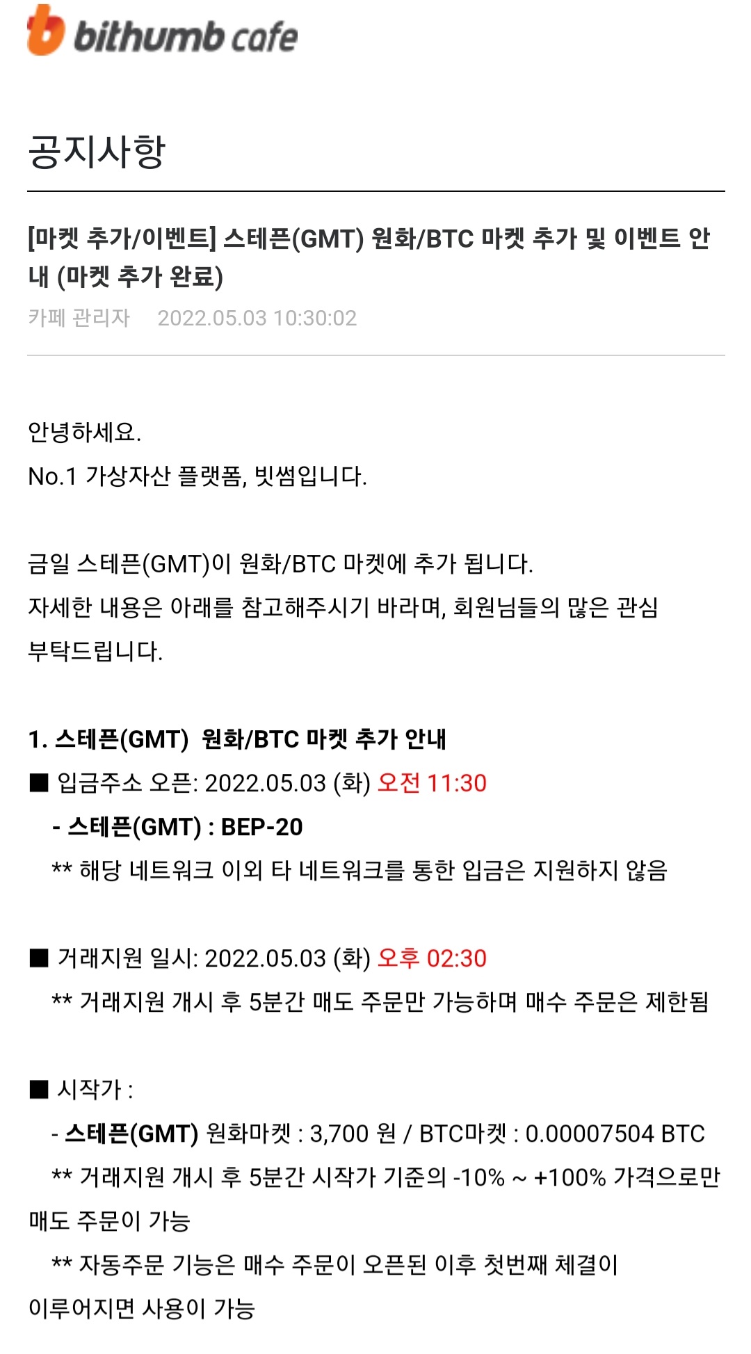 5월 3일인 어제 스테픈 코인(GMT)는 빗썸 원화, BTC 마켓 모두 상장했는데 오늘 업비트에도 원화, BTC마켓에 상장한다고 합니다. 업비트의 경우 오늘 4시에 상장합니다. 스테픈 코인에 대한 좀 더 자세한 내용은 위에 올려 놓은 이전 글을 참조하세요!