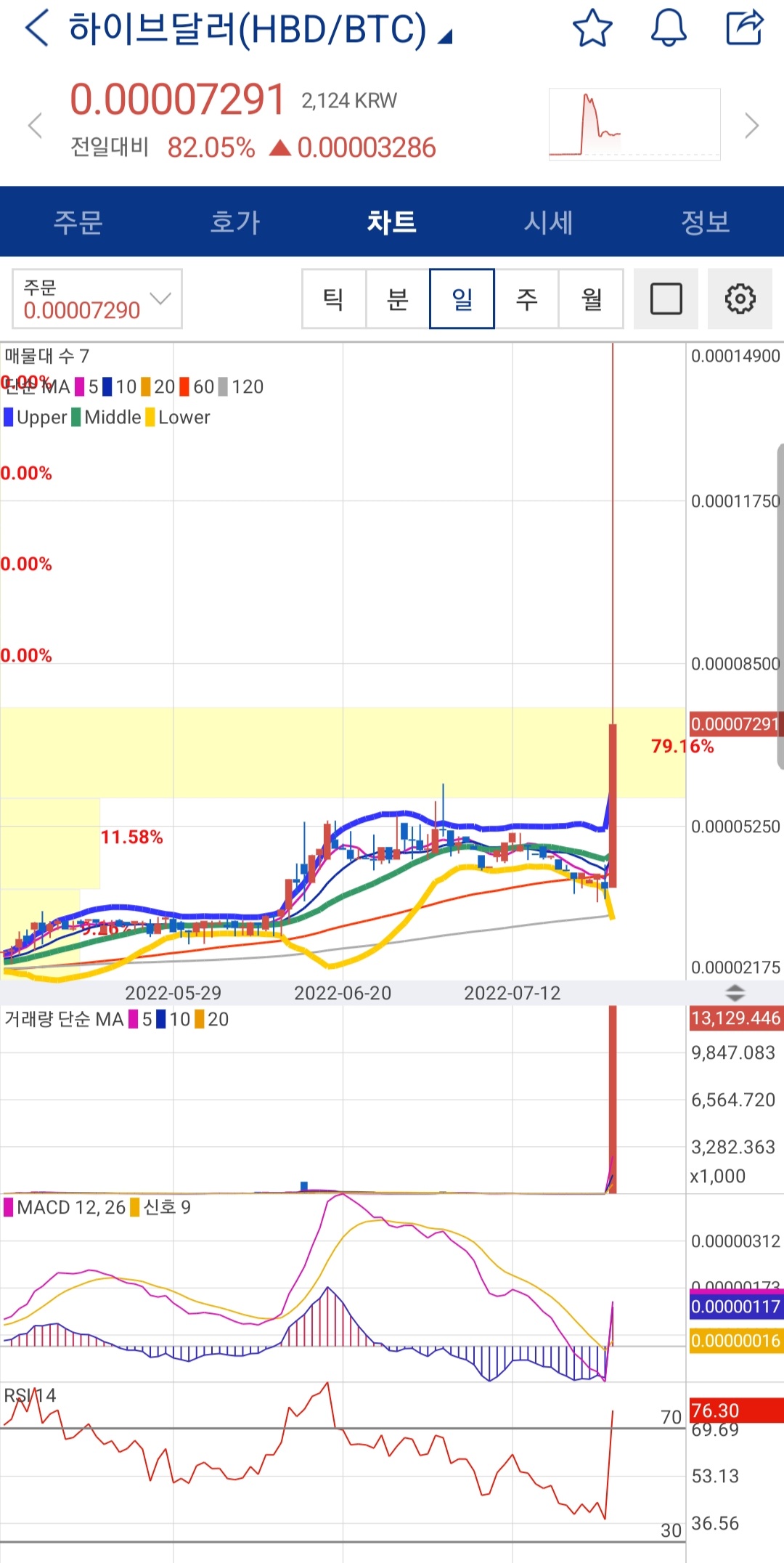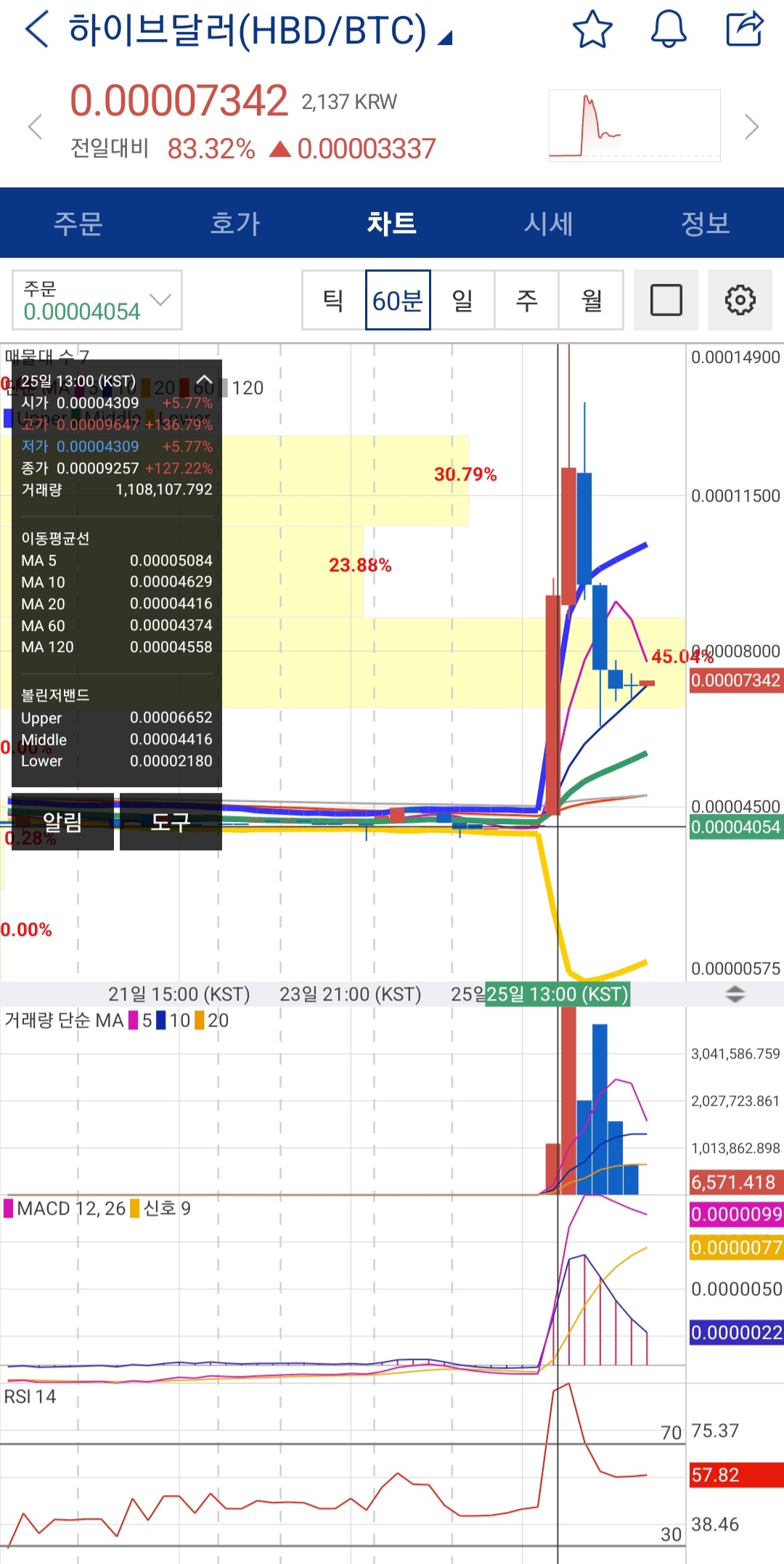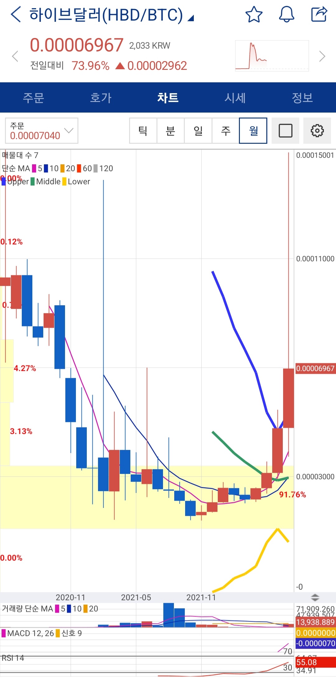 하이브달러는 오늘 오후 1시부터 두 배 오르다가 2시에도 장대양봉을 그리며 상승하다 70%대를 유지중입니다.
