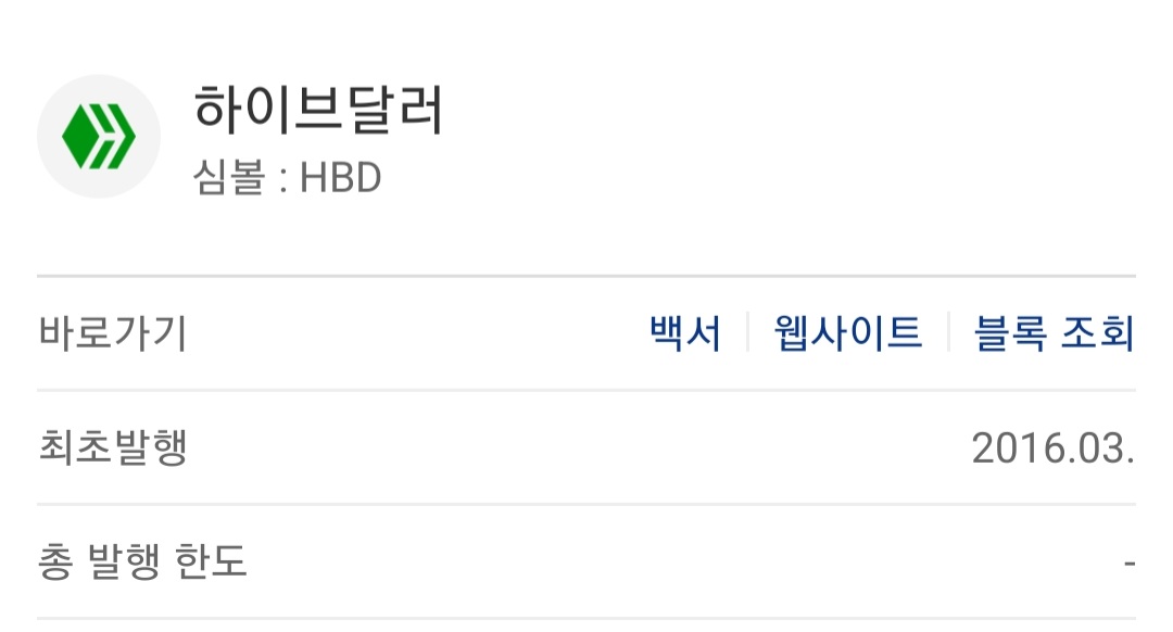 하이브달러(HBD)는 2016년에 발행되었는데 하이브 플랫폼에서 하이브(HIVE)와 함께 사용되는 토큰이자 탈중앙화 스테이블코인입니다. web3.0 코인이기도 한 하이브코인이 하이브 플랫폼에서 기능 업그레이드에 쓰인다면 하이브달러는 플랫폼 내 보상수단으로 쓰입니다. 하이브달러의 총발행한도, 유통량은 제공되지 않았네요.