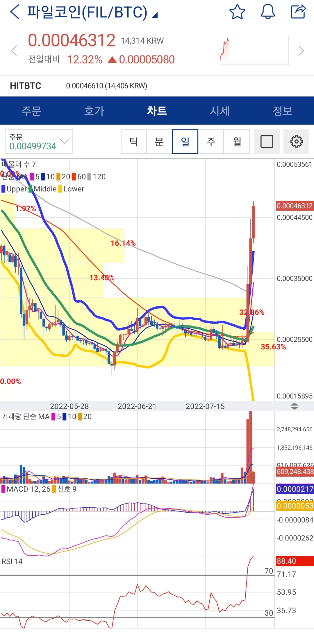파일코인의 60분 차트를 보시면 이동평균선이 정배열 상태에서 거래량을 동반한 채 7월 30일부터 8월 1일인 오늘까지 3일 연속 상승하고 있습니다.