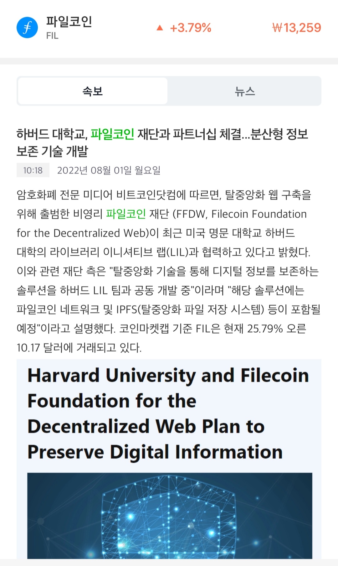 사실 파일코인은 그레이스케일 포트폴리오라는 점에서도 그렇지 않은 다른 알트코인에 비해 전망이 있다고 볼 수 있으며 오늘 코인니스 속보에 올라온 내용을 보면 하버드 대학과 협력 호재가 있었습니다. 파일코인은 하버드대학과 탈중앙화 기술을 통해 디지털 정보를 보존하는 솔루션을 개발 중이라고 합니다.