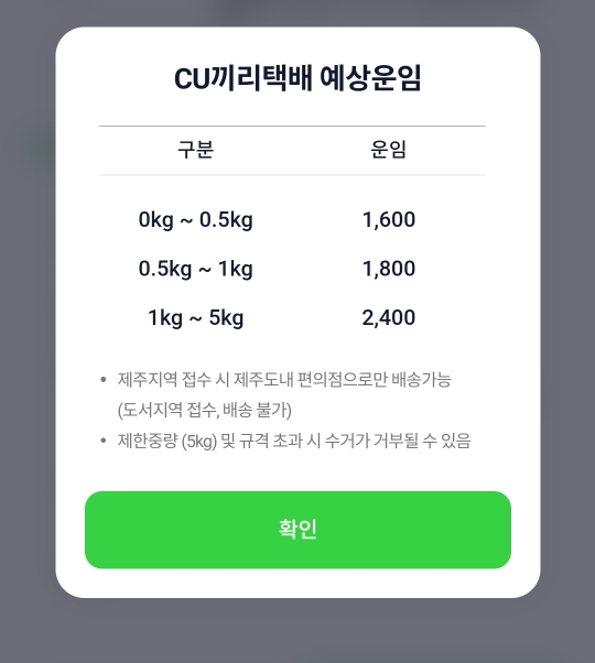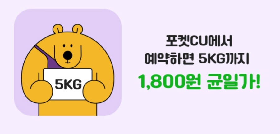앞에서도 말씀드렸지만 유용해서 다시 한번 말씀드립니다. 예약하실 때 포켓cu 어플을 이용하면 5kg까지는 무조건 1800원에 예약이 되어 저렴합니다.