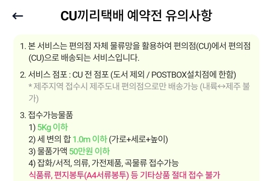 먼저 반값택배를 이용하시기 전 유의사항을 말씀드리고 아래에서 cu 반값택배 보내는 법, 가격 및 팁을 설명드리겠습니다.