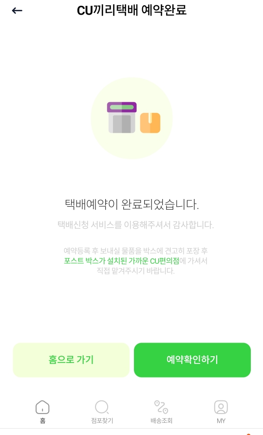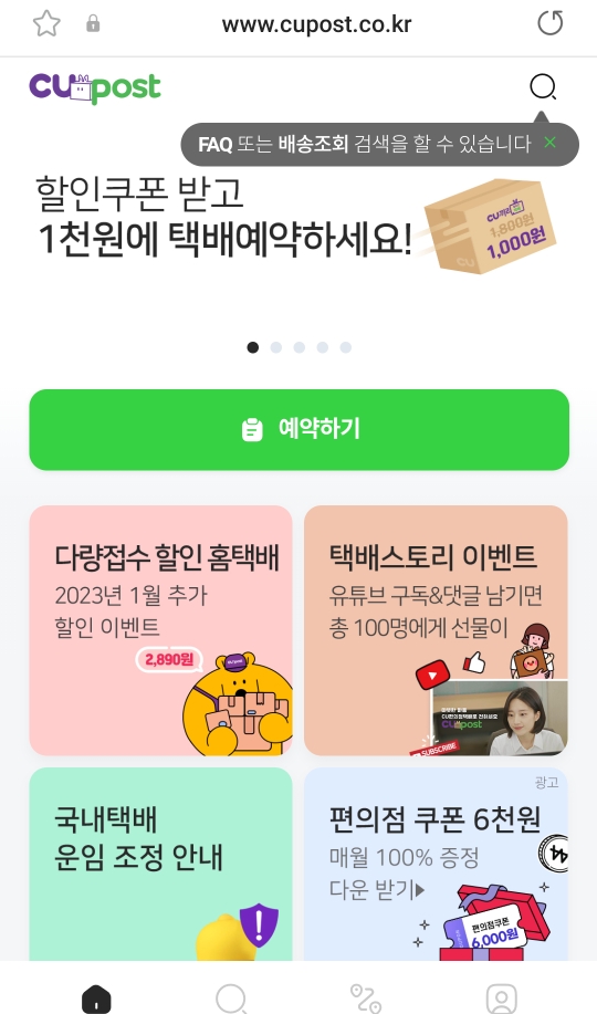 가벼운 물건이면 어플 없이 웹 cu post에서 홈 화면에 예약하기를 누르고