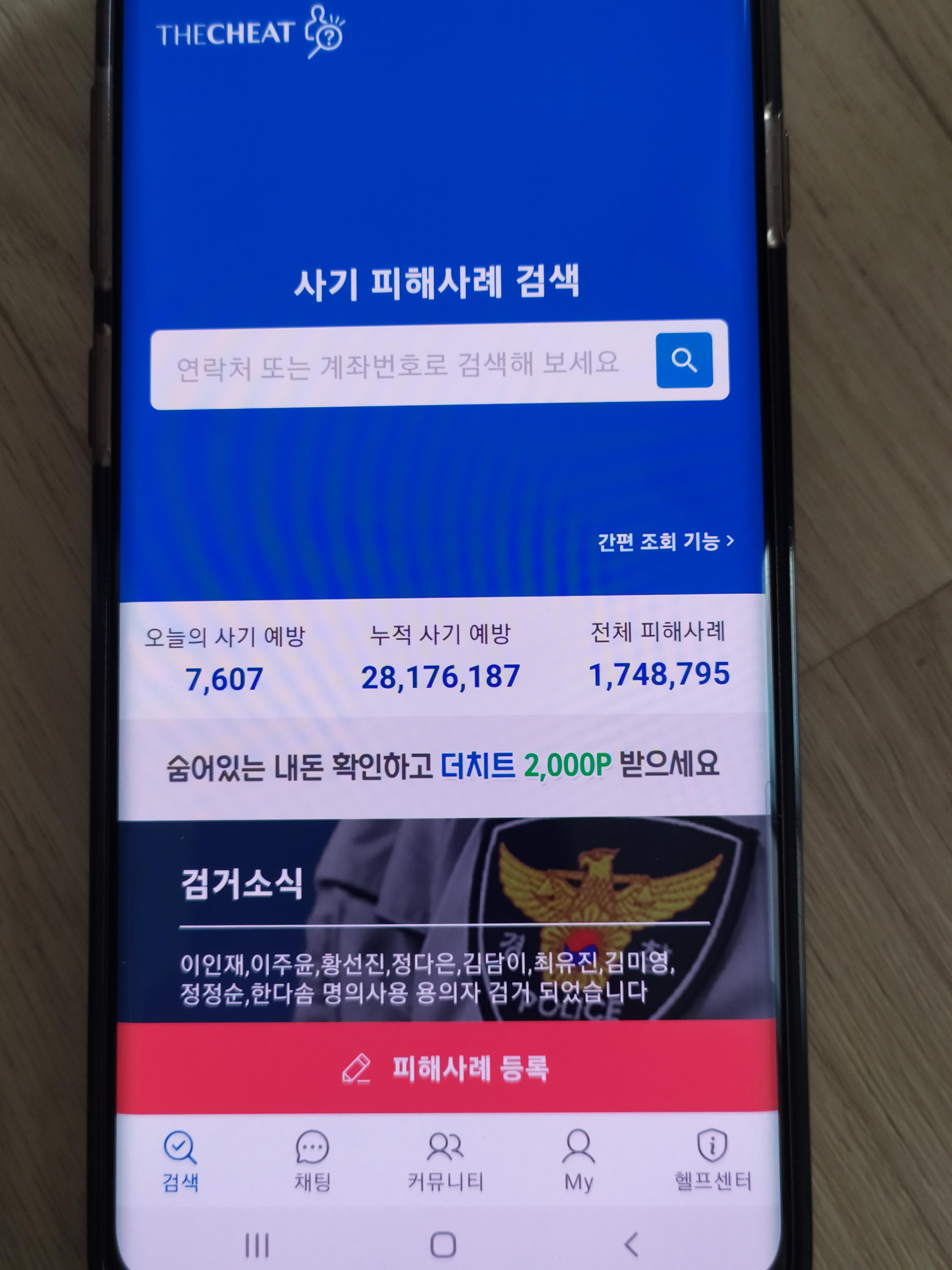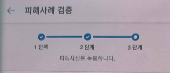 더치트 피해사례 등록은 피해사례 검증(녹음)까지 해야 최종 등록이 가능해서 녹음이 편리한 스마트폰 어플에서 등록했습니다. 플레이스토어에서 더치트 어플을 다운받아 가입을 하시면 아래 화면이 뜹니다. 참고로 더치트 어플은 캡쳐가 되지 않아서 찍어서 올리다 보니 화질은 좋지 않아요~