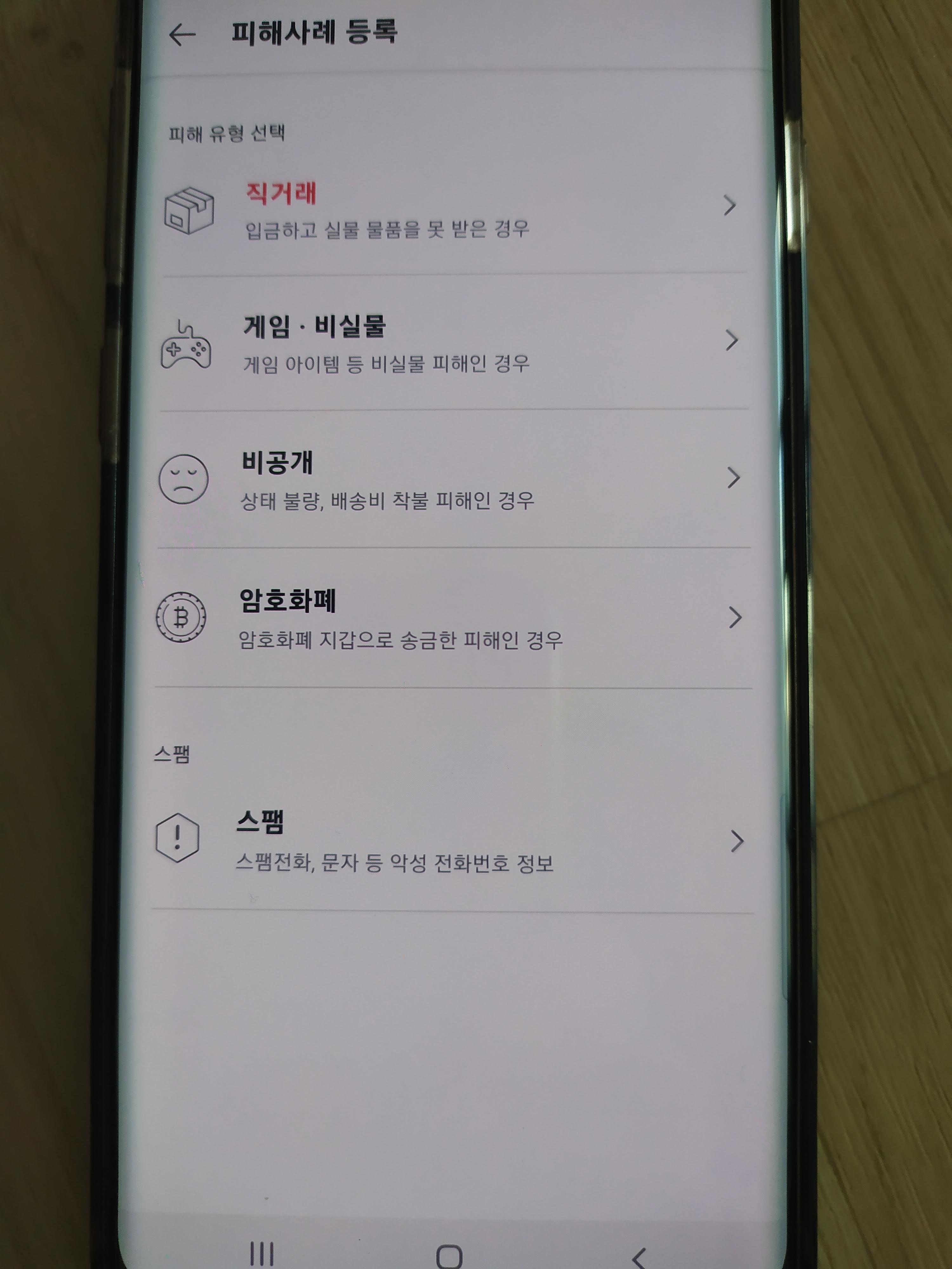 빨간 버튼의 피해사례 등록을 누른 뒤 직거래, 게임 및 비실물, 비공개, 암호화폐 등 피해 유형을 선택해 피해 사이트와 판매자 개인정보, 사건 개요 등을 등록하시면 됩니다.