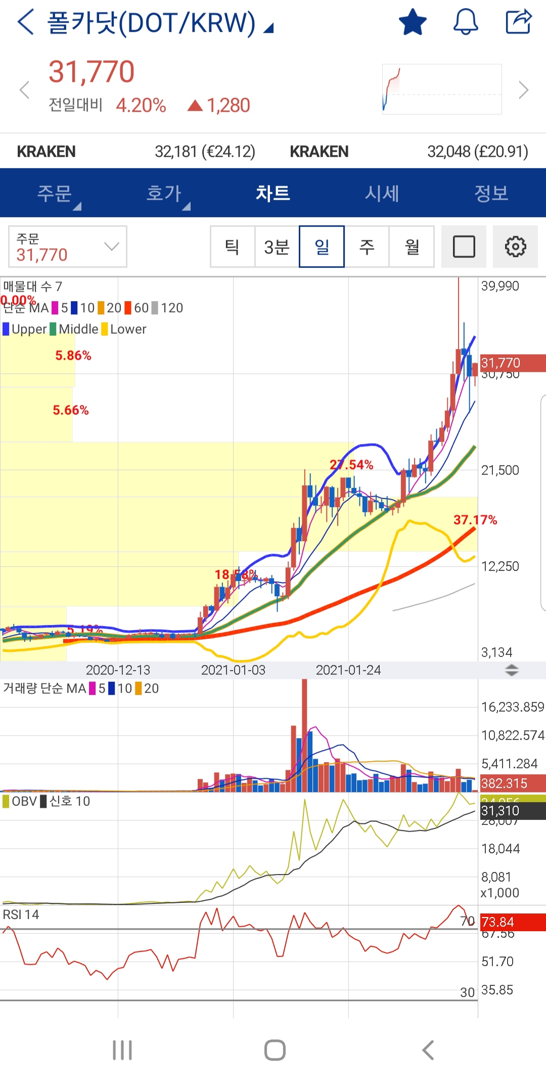 폴카닷은 국내 3대 가상화폐 거래소인 업비트, 빗썸에 작년 하반기에 5천원 아래에서 상장 후 조금씩 올라 작년 12월에 두 배, 올해 1월에 3배, 4배 올랐습니다. 그리고 2월 9일 폴카닷 기반 탈중앙화 금융 프로젝트인 라이 파이낸스와 타이달 파이낸스가 플랫폼 보안 업무협약을 체결한 뒤로 2021년 2월 13일에 39900원까지 올라 8배 올랐습니다. 오늘 기준으로 폴카닷 시세는 3만원 초반이며 시총이 28조원입니다. 주차트, 월차트는 말할 것도 없고 일차트가 우상향하고 있습니다.