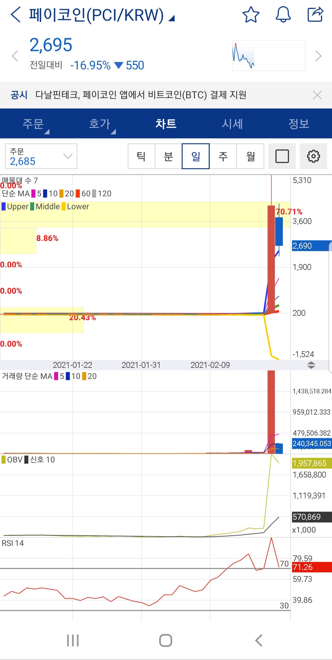 페이코인 일차트의 경우 급등해서 분석할 데이터가 적은데 60분 차트로 보면 2000원대를 지지하면 다시 한번 조금 오를 가능성이 있지만 차트로는 정확한 예측이 불가능하고 급등한 코인은 급락하기 마련이니 단기간에 섣불리 투자하시기에는 위험해 보입니다.