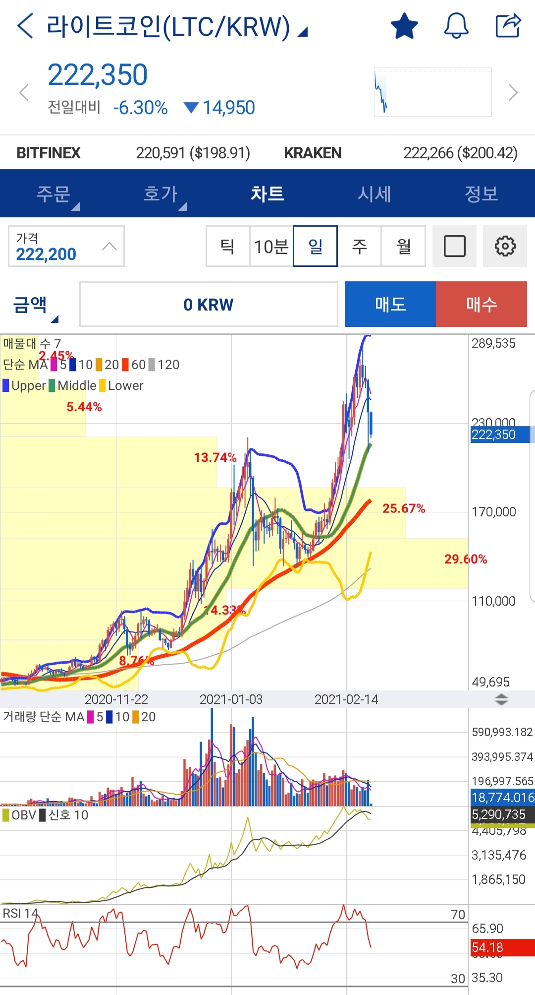 어제부터 오늘까지 양봉만 세우며 계속 우상향하던 비트코인이 6000만원을 내려오면서 시총이 낮은 코인은 물론이고 코인 시총 10위권 코인 또한 잠시 하락세를 보이고 있습니다. 라이트코인 또한 오늘 21만원대까지 떨어졌습니다. 하지만 계속 우상향할 수는 없으므로 지금까지의 차트를 분석해 보았을 때 지금의 하락이 오히려 큰 상승으로 이어진다고 생각합니다. 투자는 자신의 소신대로 해야되기 때문에 이 점은 참고만 해주세요~