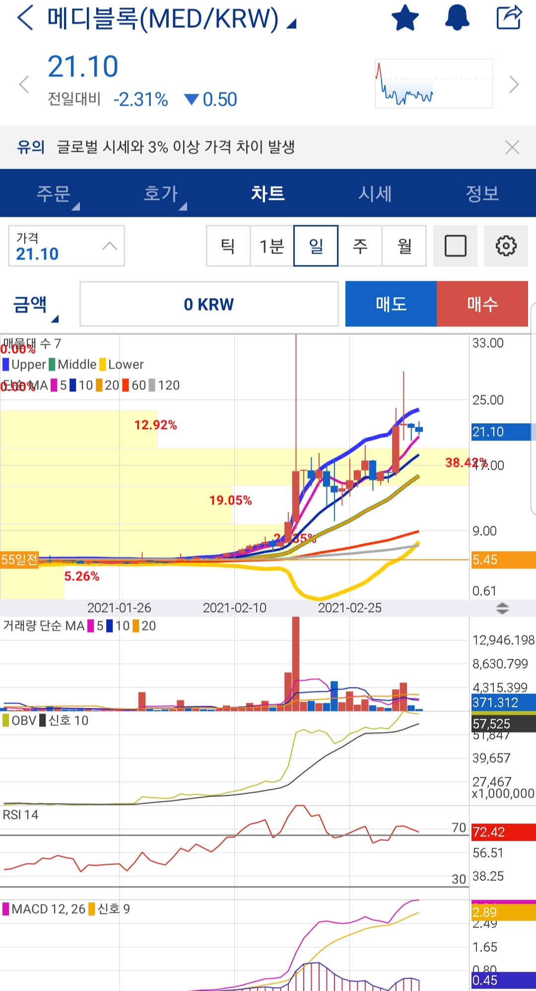 메디블록은 1, 2월 초까지만 해도 5~6원 정도였는데 2월 중순부터 10원대에 진입하다 꾸준히 우상향하여 3월에는 20원대를 유지하고 있습니다. 오늘 메디블록 시세는 저가 20.70, 고가 22.40이며 현재 21원대입니다. 비트가 불안한 상황에서도 매수벽이 10억이나 걸려 있어 세력들의 수상한 매집을 의심해 봅니다.