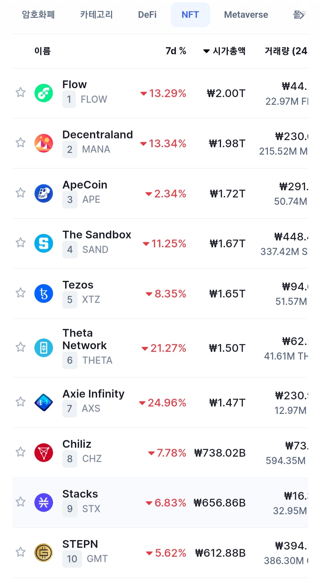 1, 2위가 쎄타토큰, 엔진에서 플로우, 디센트럴랜드로 바뀌고 에이프코인이 3위를 차지했습니다. 또한 M2E로 큰 인기를 끌었던 스테픈코인이 10위입니다.